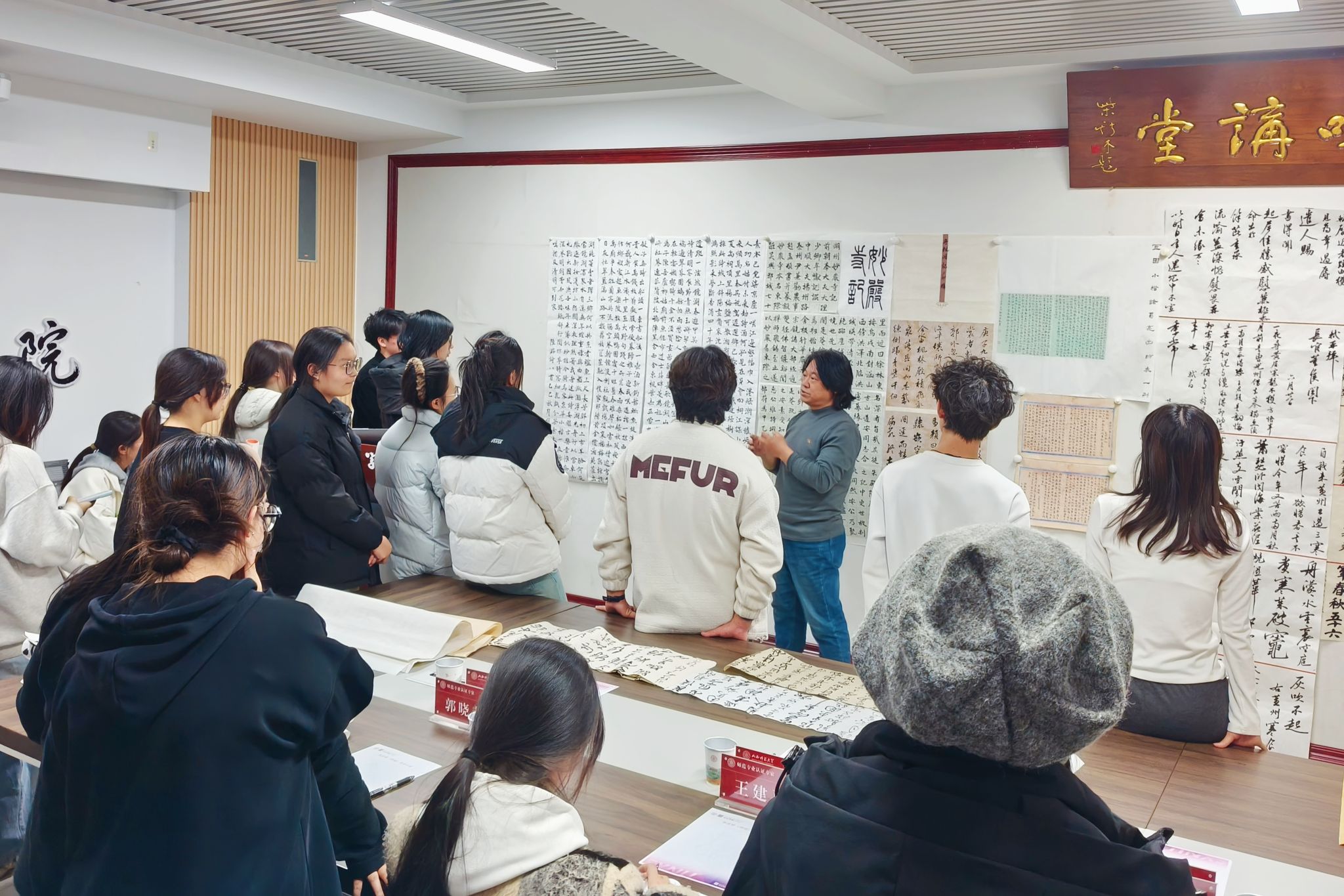 2025年11月12日晚,书法学院王建魁导师工作室在学校南区八号教学楼8301会议室召开了本学期第三次书法交流活动。本次导师会交流活动主题为大二、大三临摹作品点评,旨在提升书法专业学生临摹创作水平,王老师现场逐一指导,针对临摹创作中的关键问题提出专业建议。