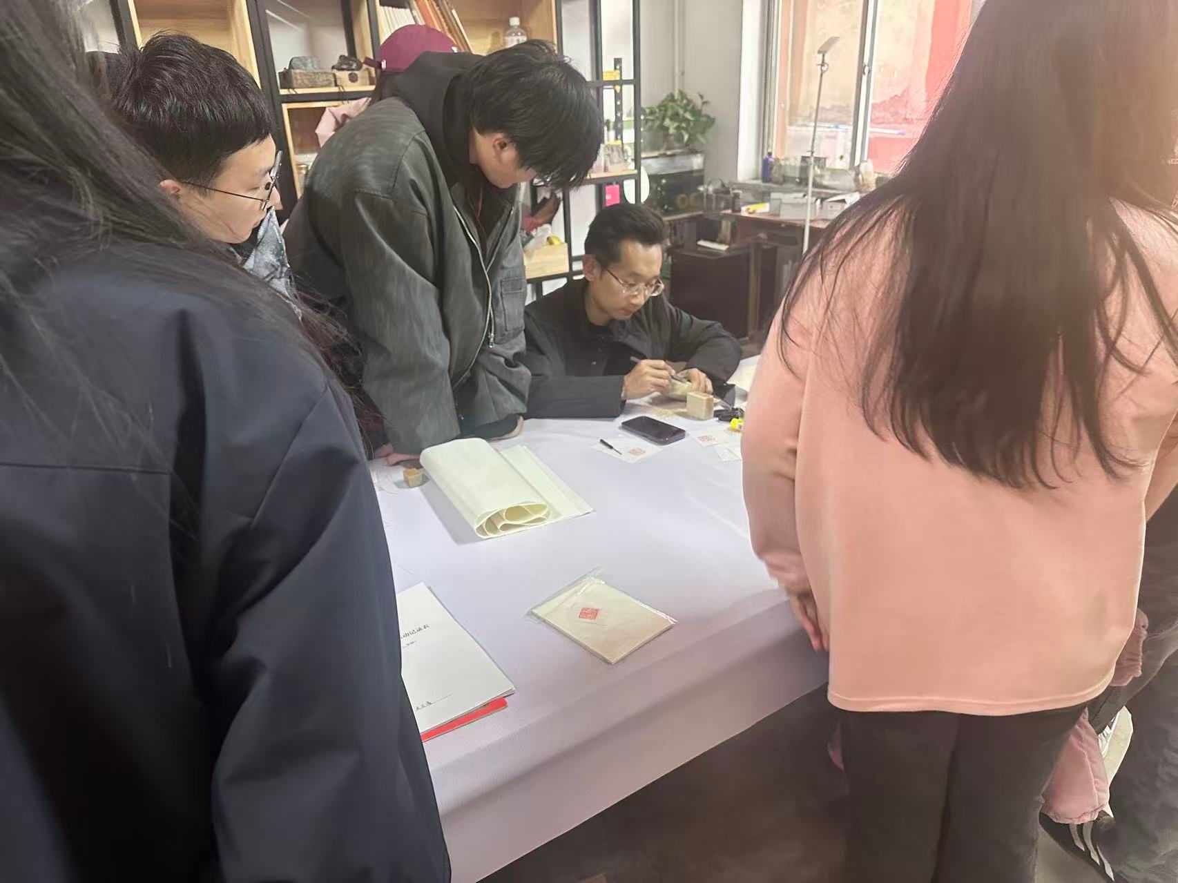 本次会议还进行了陶瓷印相关教学内容的讲解。王文清老师先为大家普及陶瓷印的材质特点、历史渊源与创作要点,让同学们对这一特色篆刻形式建立初步认知;随后现场进行陶瓷印雕刻示范,鼓励同学们动手尝试基础操作,感受陶瓷印的独特艺术魅力。