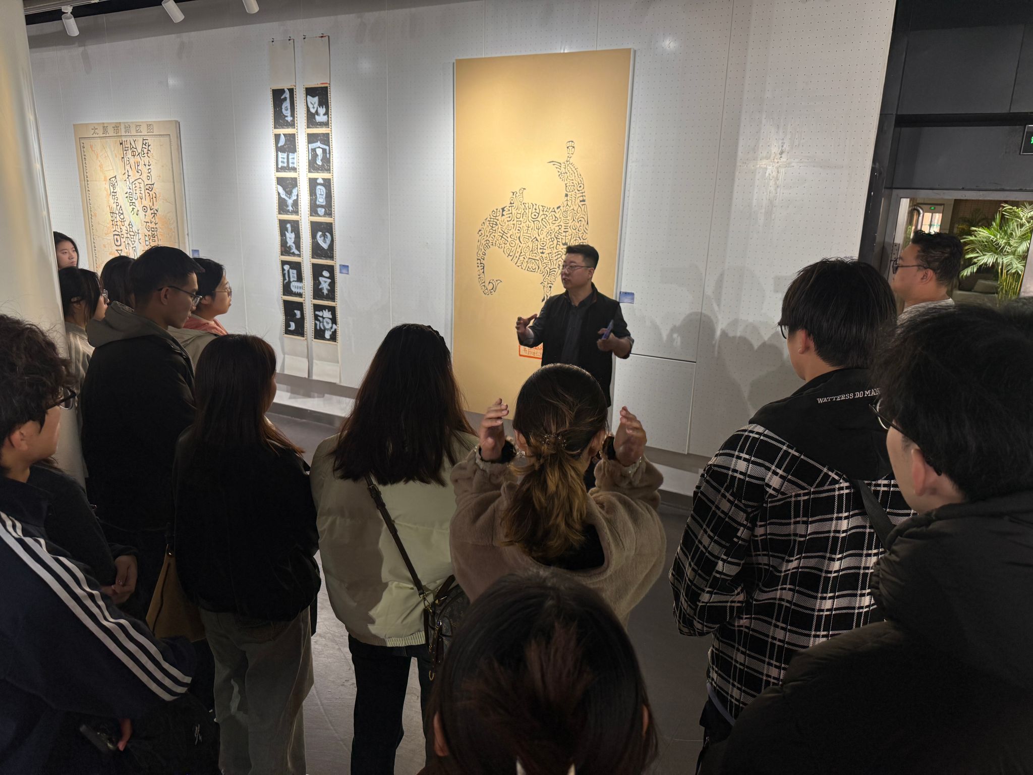 活动开场,曹亚彬老师为师生全面介绍了艺术家鲁大东的从业历程、艺术风格特点,以及本次“解晋”艺术展的策展理念与核心价值。此次展览共展出鲁大东老师120件书法艺术作品,涵盖篆书、隶书、楷书、行书、草书等多种经典书体。创作内容紧密围绕山西地区名胜古迹文化、经典诗词警句展开,深度体现了地域文化与传统书法的有机融合。