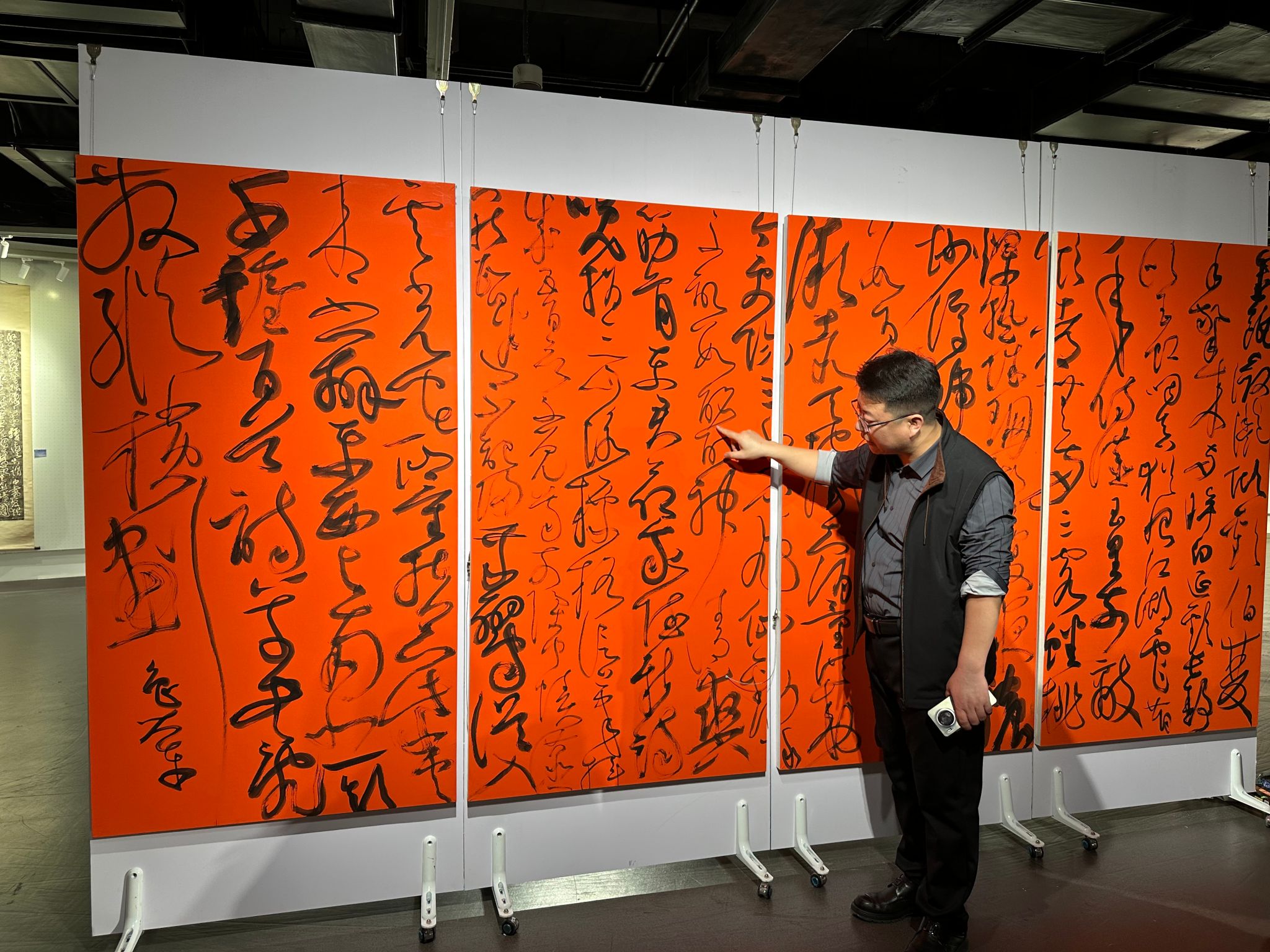 讲解过程中,曹亚彬老师结合具体展品,深入剖析作品的创作思路与艺术表达。他着重强调:“作为书法专业学生,首要任务是提升审美鉴赏能力,培养‘明辨优劣’的专业眼光,要主动从鲁大东老师的作品中汲取创新经验,思考传统书法在当代语境下的转化路径。”