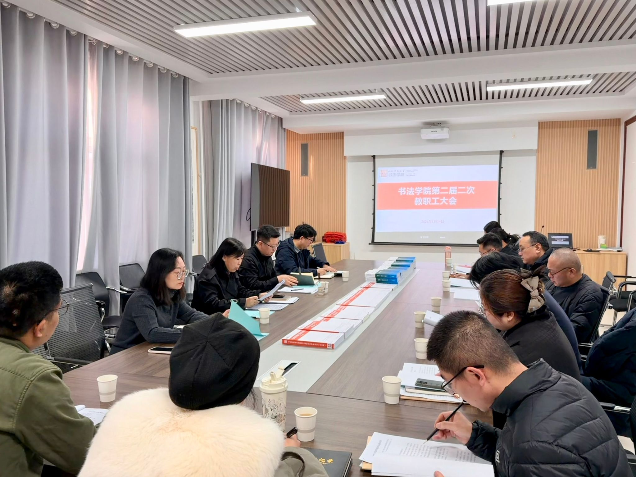 2026年1月15日,书法学院第二届二次教职工大会在庄严热烈的氛围中隆重召开。学院全体教职工齐聚一堂,共商学院发展大计。大会由学院党总支书记李企婷主持。
