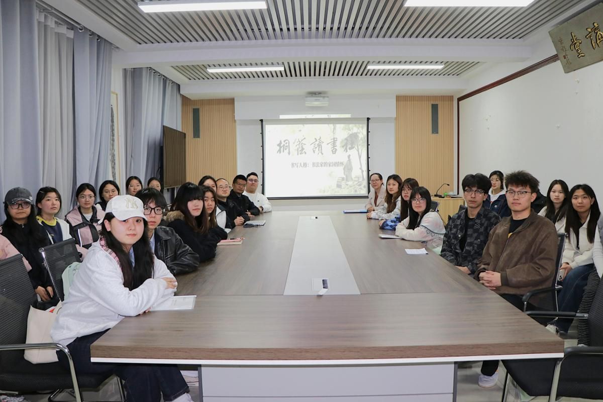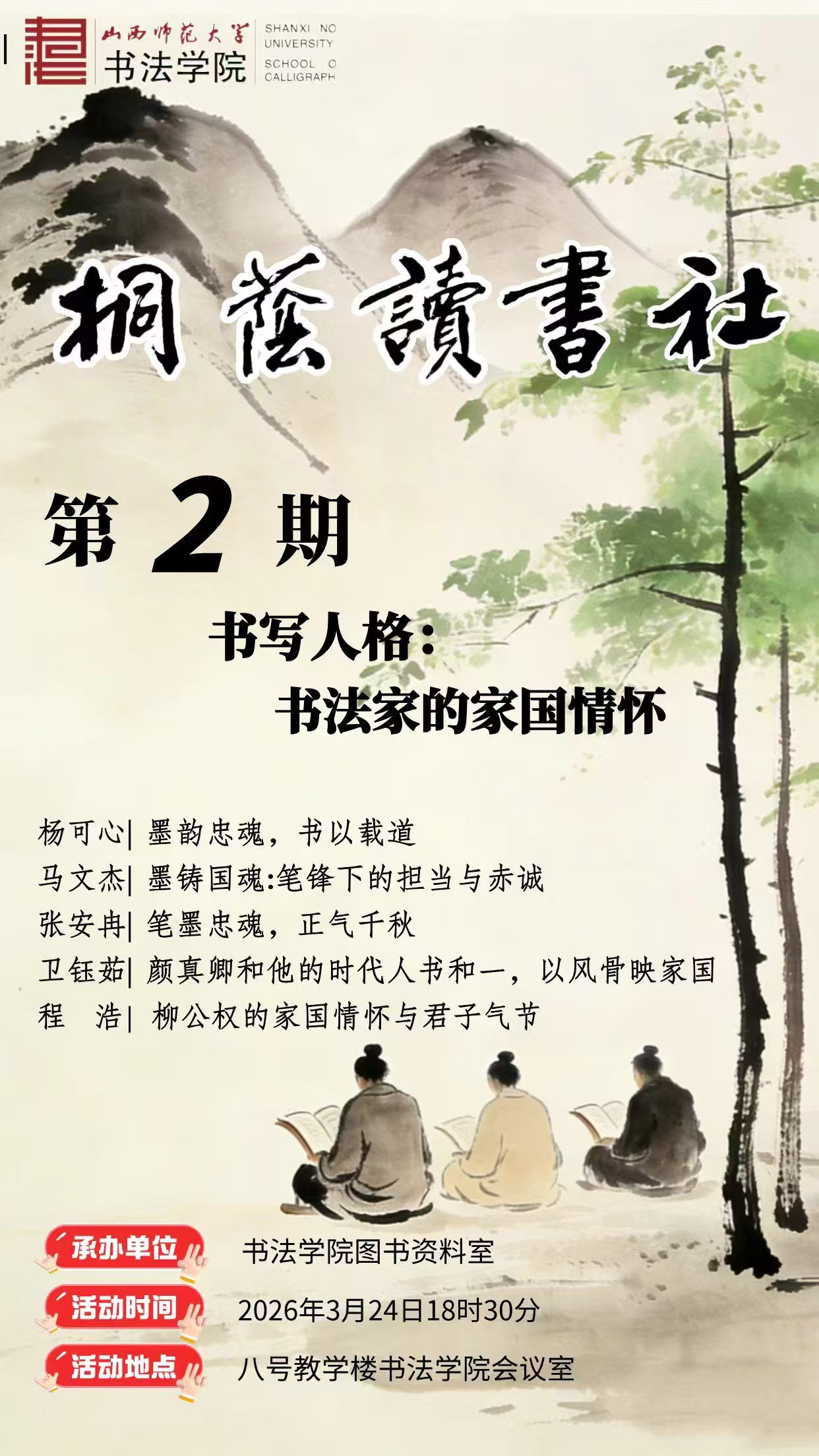 2026年3月24日,山西师范大学书法学院桐荫读书社第二期读书交流活动在八号教学楼书法学院会议室顺利举行。本期活动以“书写人格:书法家的家国情怀”为主题,程龙、胡倗、周柳伊、赵蓉等老师出席本次活动,与汇报人员及旁听学生代表齐聚一堂,共赴这场以书为媒、以字载道的思想之约。