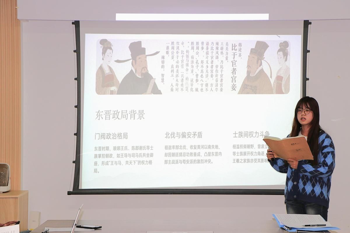 在学生分享环节,五位同学结合研读经典,多维度解读书法家笔下的赤诚与风骨。杨可心同学以《颜真卿传》为引,围绕“墨韵忠魂,书以载道”,梳理了颜真卿从书香门第入仕到忠烈殉国的一生,并结合《祭侄文稿》等作品,剖析其刚正不阿的气节如何融入笔墨之间;马文杰同学依托《王羲之评传》,以“墨铸国魂:笔锋下的担当与赤诚”为题,讲述王羲之在东晋门阀政治背景下的人生选择,阐释其书法艺术背后隐藏的士人风骨;张安冉同学品读《忠魂正气——颜真卿传》,聚焦“笔墨忠魂,正气千秋”,重点介绍琅琊颜氏家族忠义门风对颜真卿的熏陶,以及安史之乱中颜氏满门忠烈的悲壮事迹,凸显其人格与书法的高度统一;卫钰茹同学结合《颜真卿和他的时代》,分享“人书和一,以风骨映家国”的感悟,从唐代社会背景切入,分析颜真卿的政治担当与书法成就如何相互成就,展现其“心正则笔正”的艺术追求;程浩同学研读《柳公权评传》,围绕“柳公权的家国情怀与君子气节”,讲述柳公权出身华原柳氏的成长背景及其“笔谏”帝王的故事,诠释其书法中刚劲瘦硬风格与君子气节的内在关联。